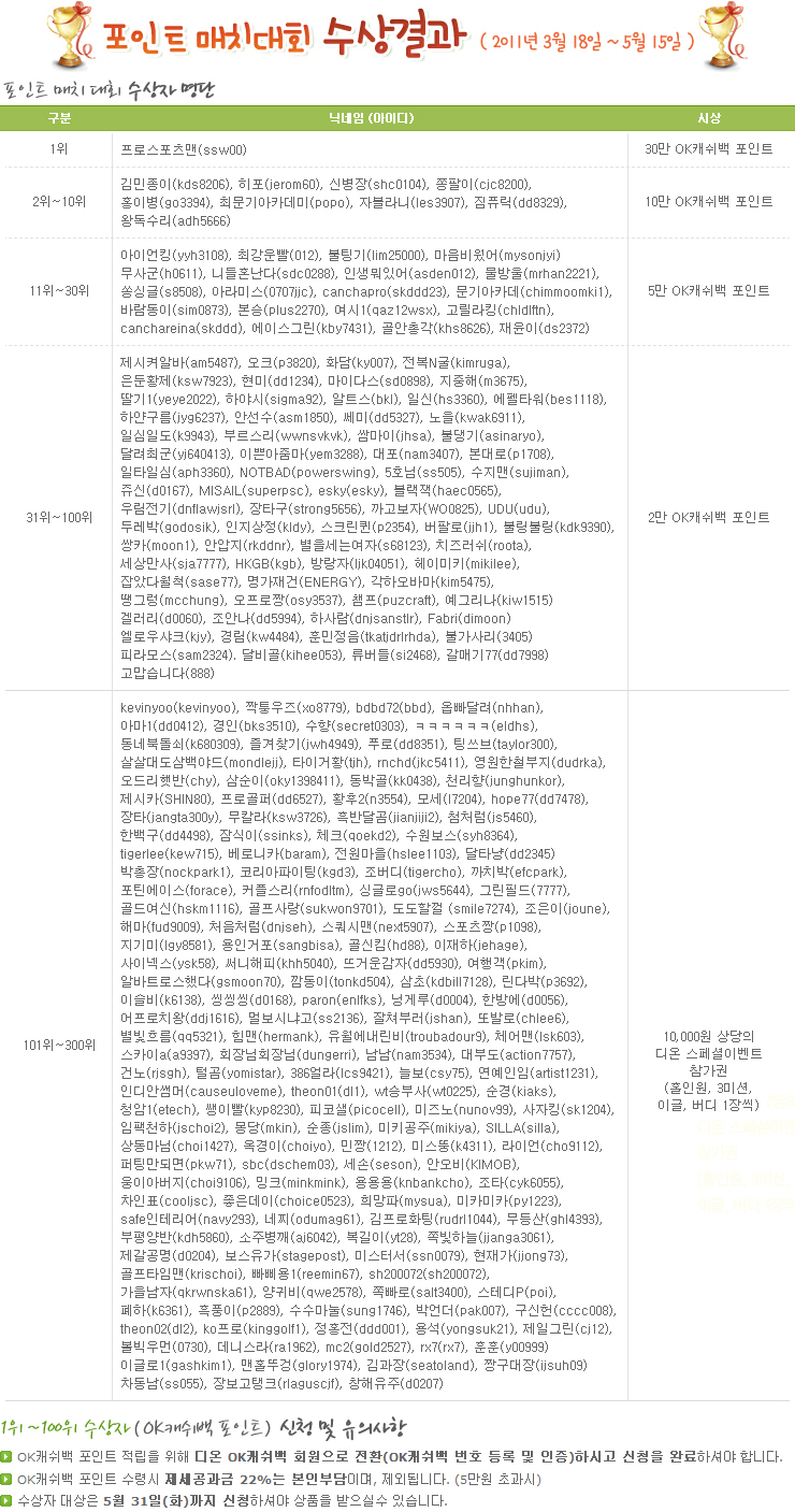 [ÀϹݰøÁö] Æ÷ÀÎÆ® ¸ÅÄ¡´ëȸ ¼ö»ó°á°ú (2011³â 3¿ù 18ÀÏ ~ 5¿ù 15ÀÏ)